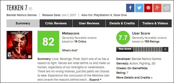 游戏测评网站metacritic给《铁拳7》打了82分的成绩 图片来源:metacritic