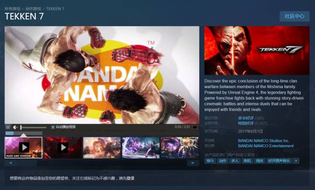 据悉,《铁拳7》是由Bandai Namco开发的一款动作格斗类游戏,于2017年6月1日发行,是街机格斗游戏《铁拳》系列的第七代作品。该作品在steam游戏平台上拥有近6000个好评。