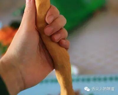 4. 再把它在面板上用手搓成均匀细条。搓的时候一边搓一边往两边拉,这样就可以轻易搓成细条了。如果你搓的时候面团不容易搓开,就说明,你的面团太干了