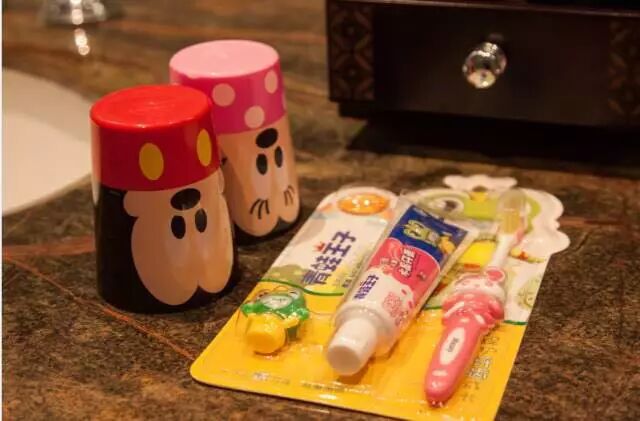 ▲ 小青蛙牙刷套装,米老鼠漱口杯,洗脸台前还备有原木增高凳,这样他们就可以轻而易举地学会自己刷牙啦!