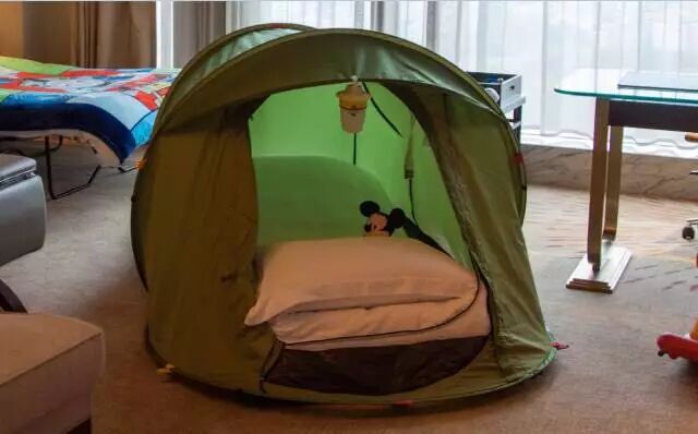 ▲酒店精心准备了选用环保材料制成的儿童帐篷,让孩子在夜里,透过客房内的落地玻璃感受到仿真的户外露营感。