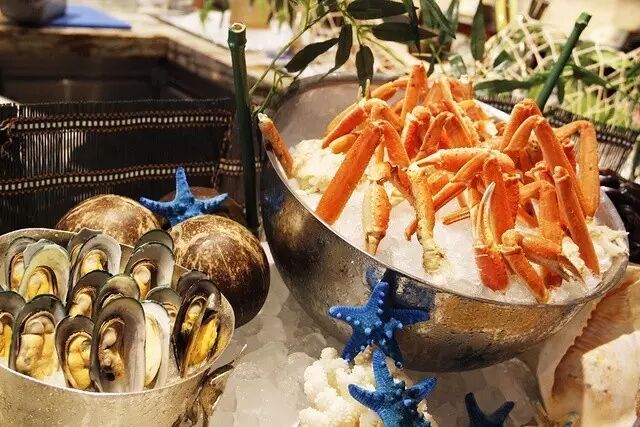 海鲜档自然是吃货“跑断腿”的地方,鲜虾、贻口贝等海鲜应有尽有;刺身排排放,口感很嫩,而且新鲜,寿司任你吃;