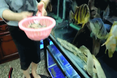 辣妈阿奴平常最爱的事情就是给自己的鱼喂食