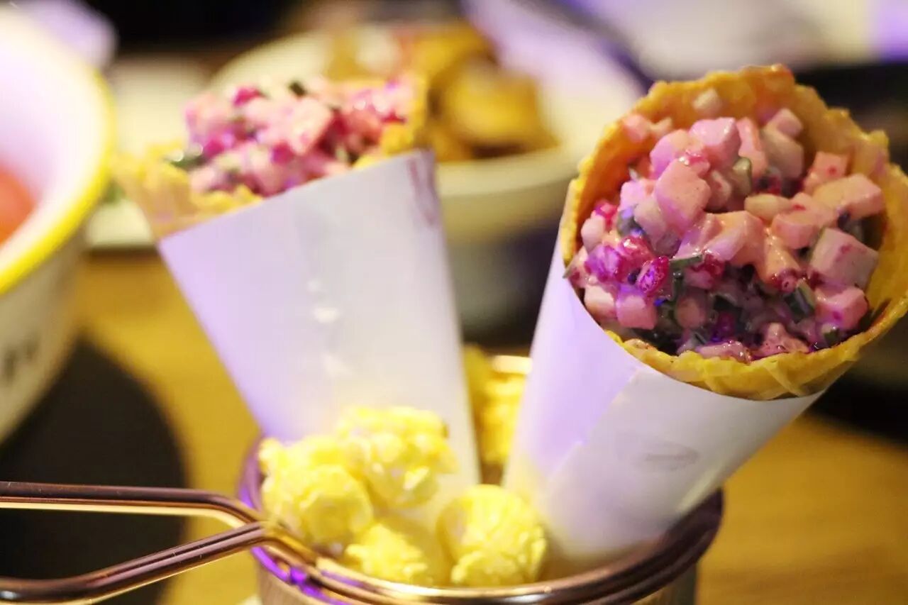 甜筒配沙拉?酸甜的沙拉酱搭配水果丁,肉眼可见的火龙果、黄瓜、苹果、冰淇淋…甜筒外围还有一圈爆米花,颜值满分!吸睛更是满分!