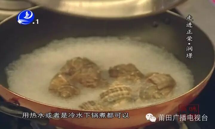 第四步:把洗好的花螺倒入装有冷水的锅中,慢慢加温,不断搅动。