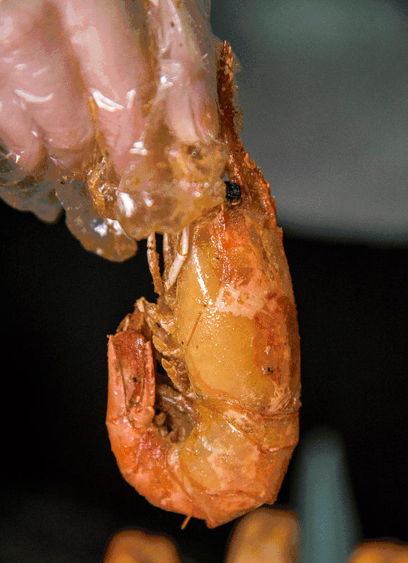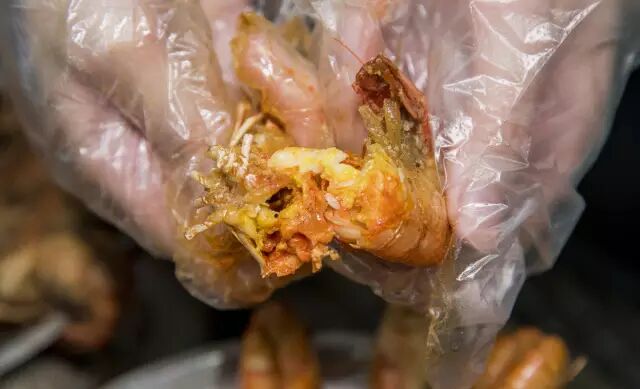 剥开虾头发现有虾黄的,必须先要嚼一下虾头,这才是正确吃虾的方式。入口鲜甜,令你情不自禁吮吮手指头~