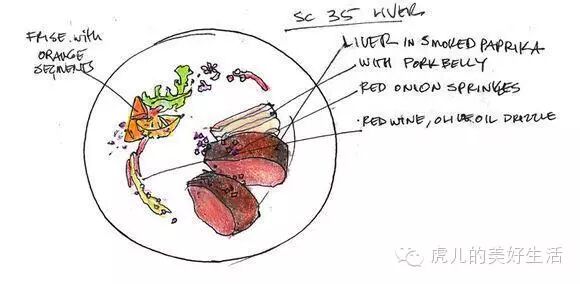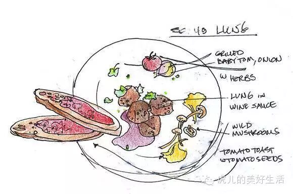 配菜:烤小番茄和洋葱和草本植物、肺搭配酱酒还有野生蘑菇、番茄烤面包配番茄籽。
