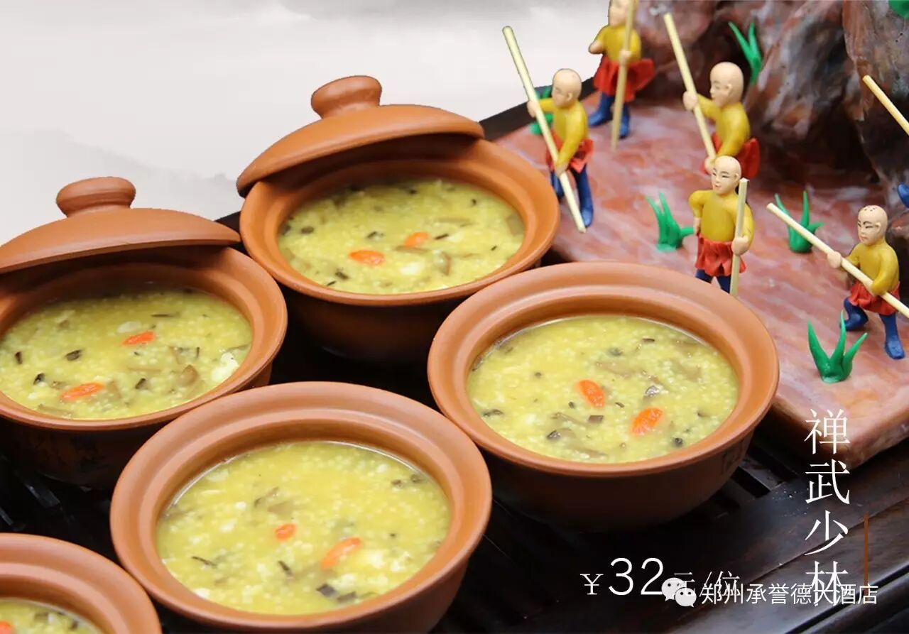 这是一道动静结合、禅武一体、内含丰富的美味佳肴,精选菌类、小米、核桃仁熬制而成的营养粥,此菜寓意:心似明月朗,身体赛金刚!