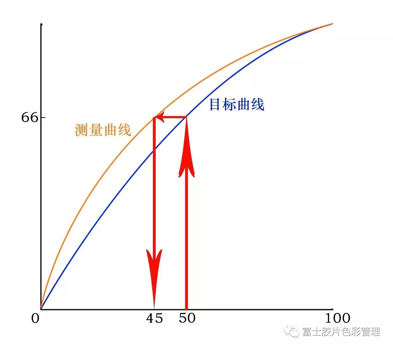 这时候根据印刷测试印张测量结果,对出版网点进行反补偿是一个行之有效的方法。比如,下图中,蓝色为ISO标准网点扩大目标曲线,橙色为测量曲线,怎么计算50%的补偿数值是多少呢?在横轴50%的地方垂直向上划线与目标曲线相交,然后水平向测量曲线划线使其相交,最后再垂直向下向横轴划线,横轴45%就是补偿后的网点值,即相同条件下,45%印刷出来刚好达到50%应该要达到的目标曲线,依次可计算出整个阶调的补偿数据,这种方法在数学上叫做“反函数运算”。这仅为单色版的计算,依次可计算出其他三色版的补偿曲线。