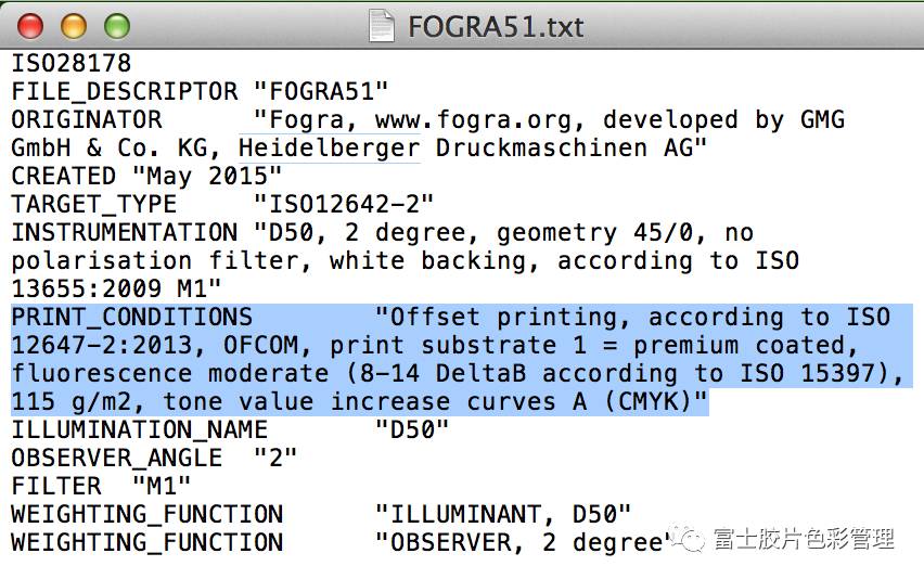 这种方法由来已久,完全按照ISO12647的要求进行校准,但其他参数也必须与ISO规定的一致才能得到比较好的结果,比如色序必须是KCMY,所使用的材料、印刷方式、测量方式也必须一致。特别对于匹配Fogra数据集,则优先采用此种方法。例如Fogra 51(2015年发布,依据ISO 12647-2:2013,将来可能逐步取代Fogra 39)的印刷条件如下:
