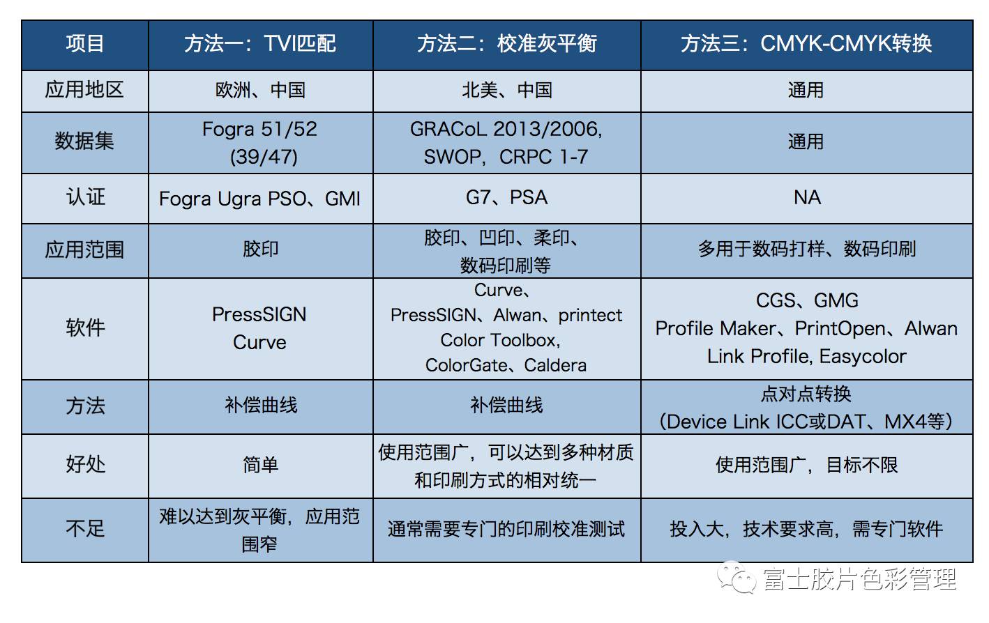 此法在欧洲和中国都比较盛行,特别近几年,伴随着相关软件的流行,如PressSIGN、MellowColor等,其测量色带后便可以直接生成补偿曲线,大大提高了校准的效率和方便性。一些行业内的认证,如Fogra /Ugra PSO 及GMI认证等,都要求网点扩大必须在容差范围内。但该方法基于单色印版的单独调整,虽然也对CMY网点扩大的相对差异提出了要求,但在实际操作上往往比较麻烦,比较难以得到好的灰平衡表现。同时由于不同的材料采用不同的网点扩大曲线,也造成了色彩的不一致。