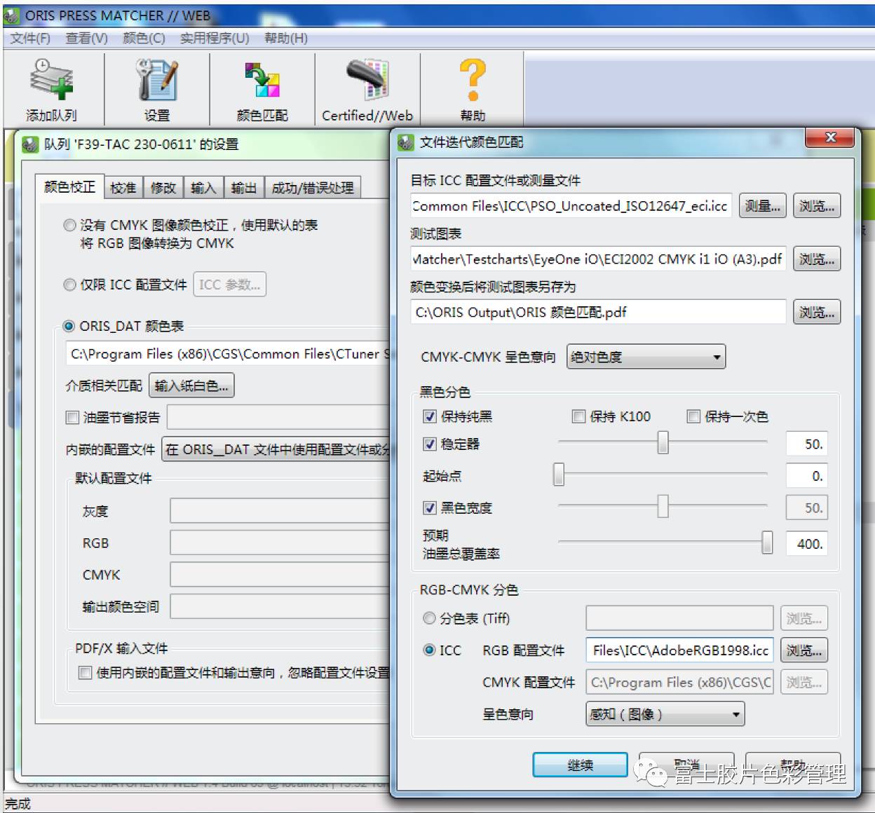 常规ICC Profile进行色彩转换 ,需要先将设备色彩空间,如RGB或CMYK,转换到与设备无关的色彩空间,通常为Lab或XYZ色彩空间,然后再转换到另一个设备色彩空间如RGB或CMYK。经过两次转换,颜色必然有所损失。而CMYK到CMYK这种方法省去了中间的PCS,它的优点是色彩转换更加精确,并且可以单独控制CMYK,保持原色的纯净,特别是黑通道,这一点意义重大,可以避免了单黑文字和细线被转换为四色黑而造成的套印不准的故障,在某些专业的软件中,如CGS ORIS Pressmatcher等,还可以控制黑色加入的起点、黑色宽度等更有用的参数,由于黑色的加入,使得在印刷过程中的色彩控制更加容易,灰平衡表现更加稳定,同时也达到了省墨(基于GCR/UCR)的目的。