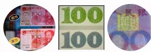 3.看专用油墨印刷图案,真钞光变油墨面额数字在光源角度改变有绿色和蓝色颜色的渐变,假钞反之;