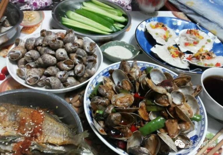 灼花螺、金银蒜粉丝蒸扇贝、辣炒花蛤、香煎小黄鱼、小黄瓜