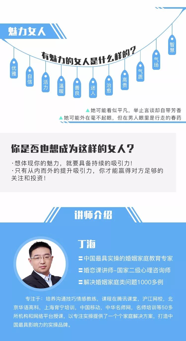 为了实实在在的地帮助大家,丁海导师推掉了很多重要的工作,亲自打造了婚姻女性魅力课程。将他多年扎根于心理学,悟出来的实用心得与方法与大家分享!