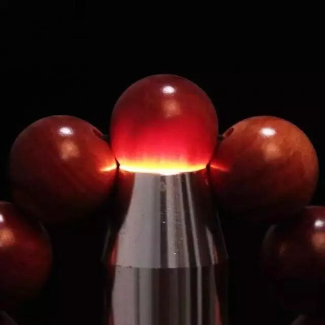 血龙木散发着红色光泽,表面伴有金丝木纹,庄重喜庆,制成手串特别漂亮。如果是在强光照射下,看上去会更加晶莹剔透,加上油分足,更容易盘出漂亮的包浆。