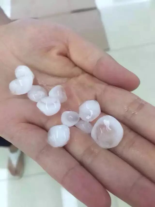 据中国天气网,昨天(30日)下午5时多,广东江门新会会城、双水等多个镇下起了暴雨和冰雹,并伴有短时大风(最大阵风10级)。据观测,冰雹出现长达10分钟,最大直径18毫米,参考网友提供的照片,冰雹直径大多约20毫米。