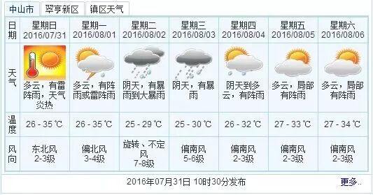 7月31日-8月1日白天,我市天气炎热,局部有阵雨或雷阵雨。8月1日夜间到3日,随着台风靠近我省,我市将有暴雨到大暴雨的降水过程,台风中心经过地区将有12级以上大风,将严重影响我市。