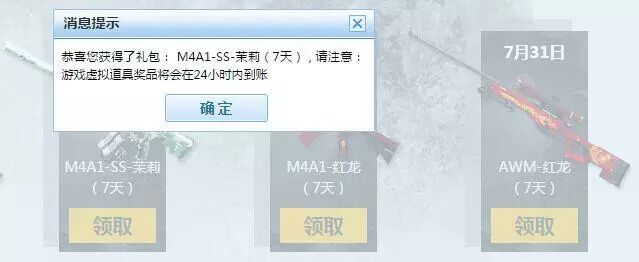 结束时间为7月31日,恭喜您获得了礼包: -SS-茉莉(7天) , 请注意:游戏虚拟道具奖品将会在24小时内到账。没错,今天可以领到传说中的茉莉-SS,小编会说,好多人都没有用到过吗?就是今天领,接下来两天是-红龙(也不错),AWM-红龙(知道很多人不屑)。