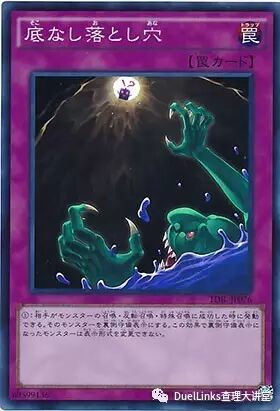 无底陷坑是新出的卡包“天位骑士”卡包里面的一张UR卡,其作用是在对手召唤怪兽的时候让他翻转成里侧表示,并且对手不可以翻转过来。如果你翻转了对手一张强力的上级怪物,比如对方以三星降阶出来的卡通手枪龙,那么你可以很大程度的取得优势。