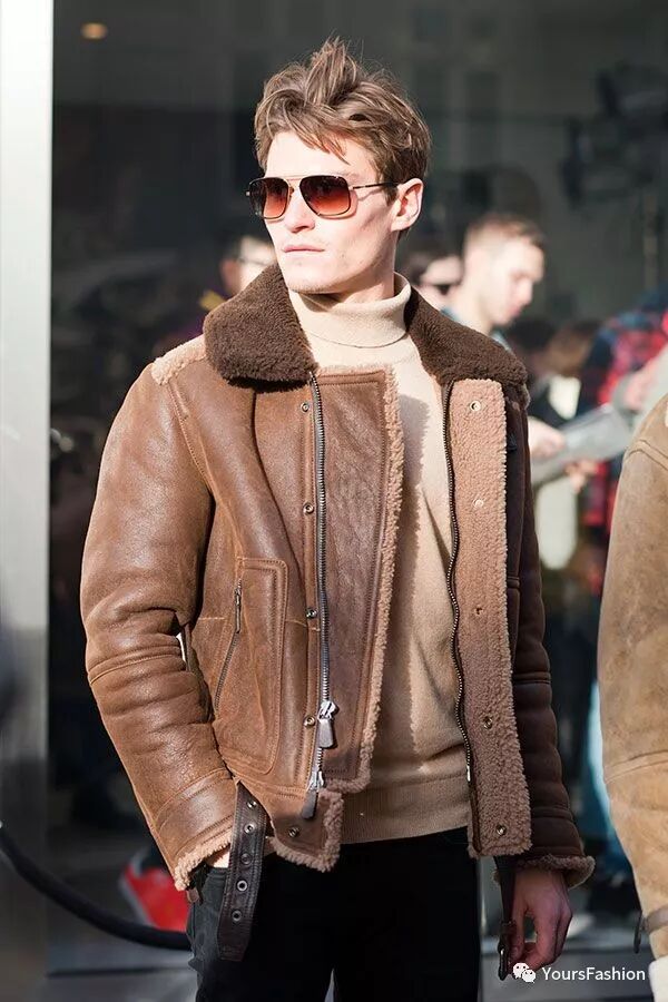 自带硬汉、酷炫属性的翻毛羊羔绒外套,搭配一身黑,只会让你更有神秘魅力,更硬汉显身高。