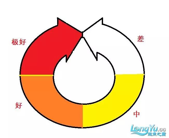 以30-40cm正常饲养的龙鱼为例,鳃盖发色面积为半鳃,即刚刚铺满A区上半部,下半部几乎亮白,不管上半部颜色多红多厚,这样的鱼想满腮几乎不可能。而同样这个尺寸的鱼,发色面积为大半鳃,即已经突破A区横线,冲到鳃盖下半部,把鳃盖后半部几乎晕满的情况下,满腮可以期待!这个品质的鱼会有60-70%的机会冲满腮。如果此时同尺寸的鱼发色面积已经几乎满腮,只留下唇后半个指甲大小的区域没有补满,那它一定会满腮!!你不要说大鱼多等几年,一定会满腮!不会!即便再通过外界手段诱色,虽然一段时间满腮,但一旦手段撤除,颜色一定会褪。而具备满腮素质的鱼自然而然就会满,这是鱼种决定的,是鱼的血统决定的。