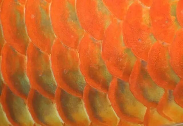 鳞片满片亮,但是鳞片边缘根本没有什么亮框(鳞底只有亮,几乎没有什么颜色)。这种亮的方式发色会慢一点,但一定会红,而且会很红。