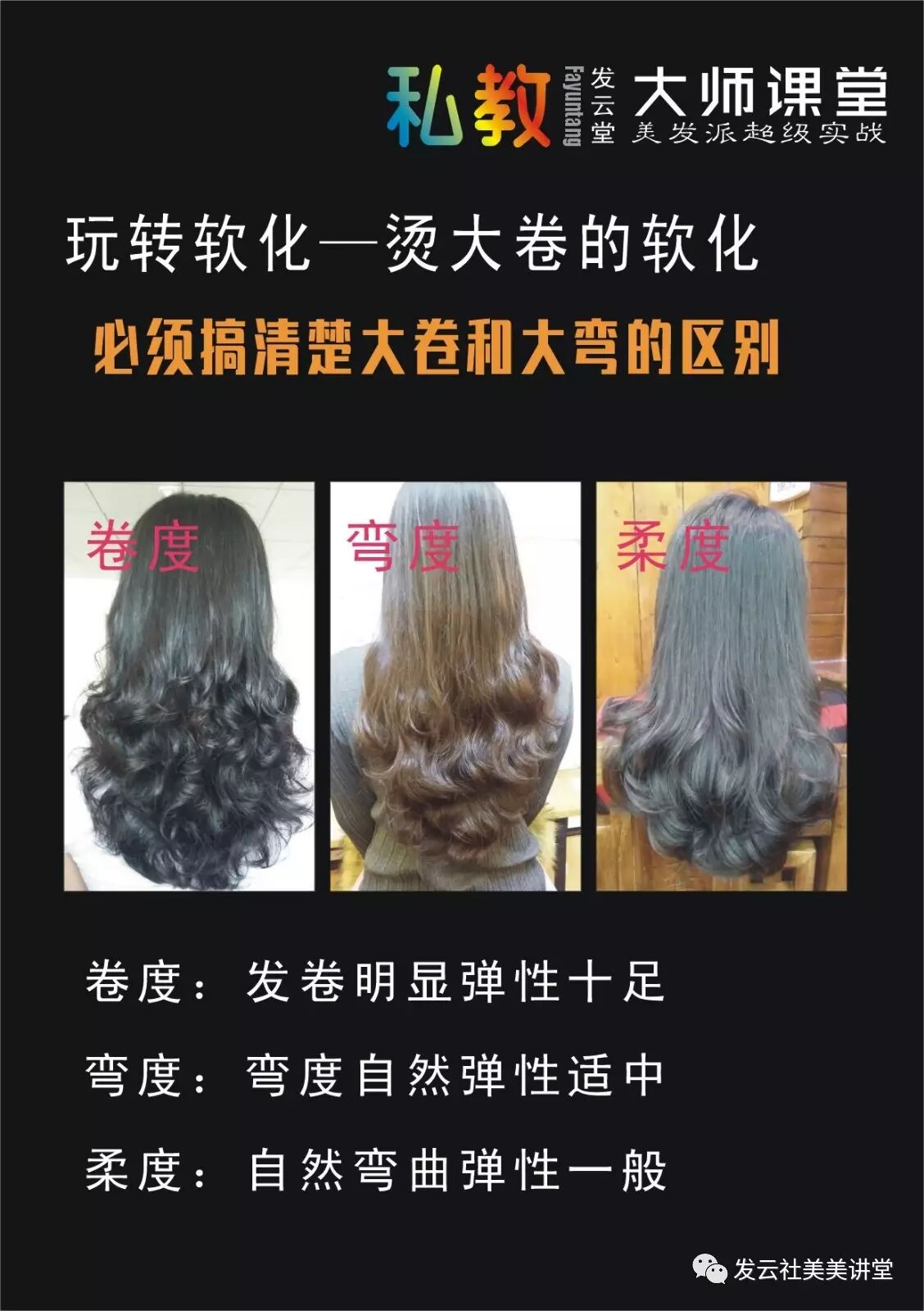因为顾客没有概念,作为发型师的你,就必须有概念,否则就容易出现烫后扯皮。那么你就要了解卷、弯和柔的区别,在和顾客沟通的时候,最好找出对应的图片,让顾客知道这三者之间的区别,结果就变得很简单,投诉率也会大大降低了。