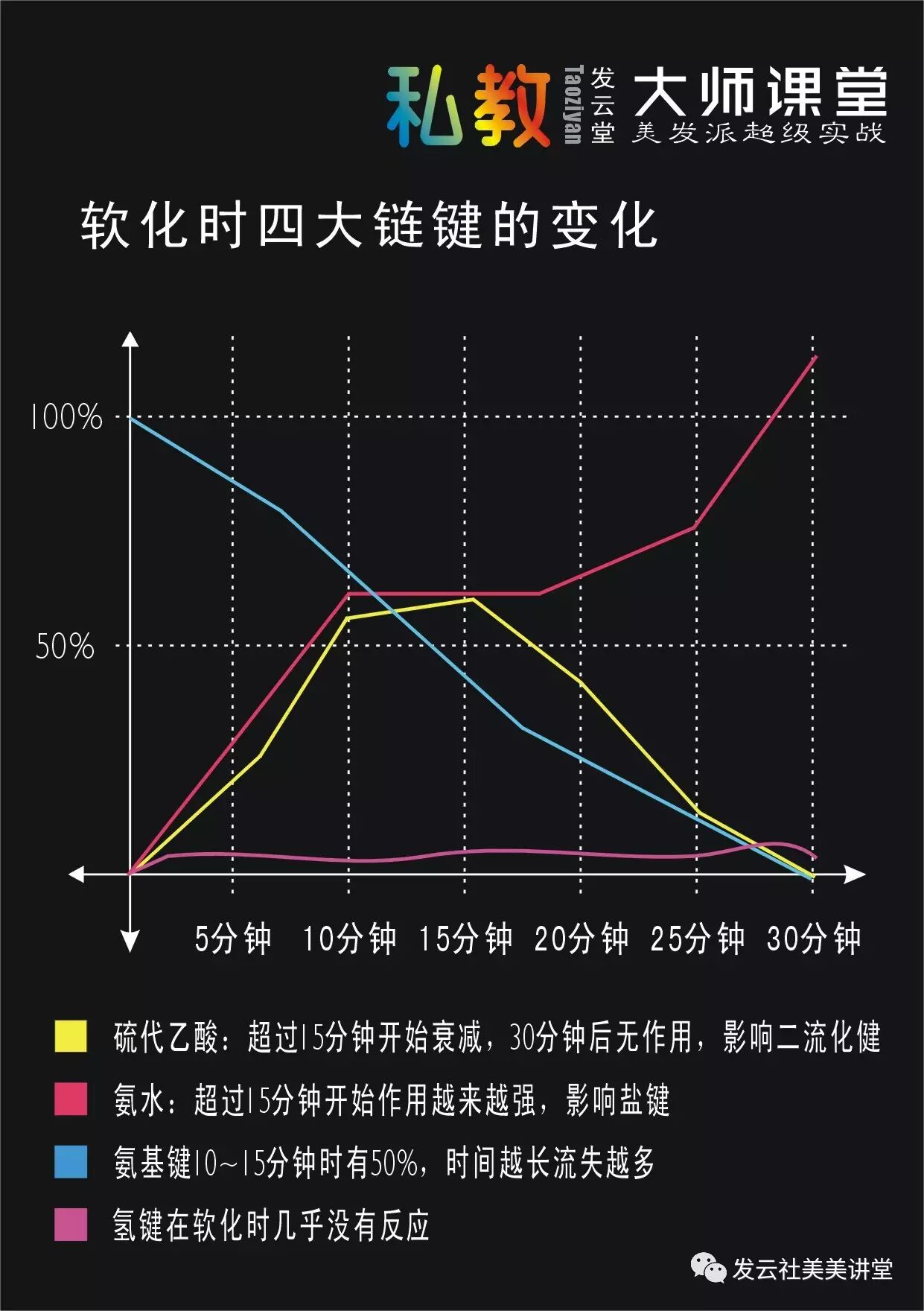 从图中可以看出四条链键在烫发的时候,氨基键会随着时间的延长而流失,一旦流失烫后的弹性就消失,要么有卷没弹性、要么变成僵硬的死卷。而氨水也会随着时间的增长而作用越来越强,对盐键造成损伤,导致头发干燥。流代超过15分钟就开始衰减,作用逐渐减弱。尽管在这个时候氢键几乎没有作用,但是却为下一步的加热打下了一个好的基础。