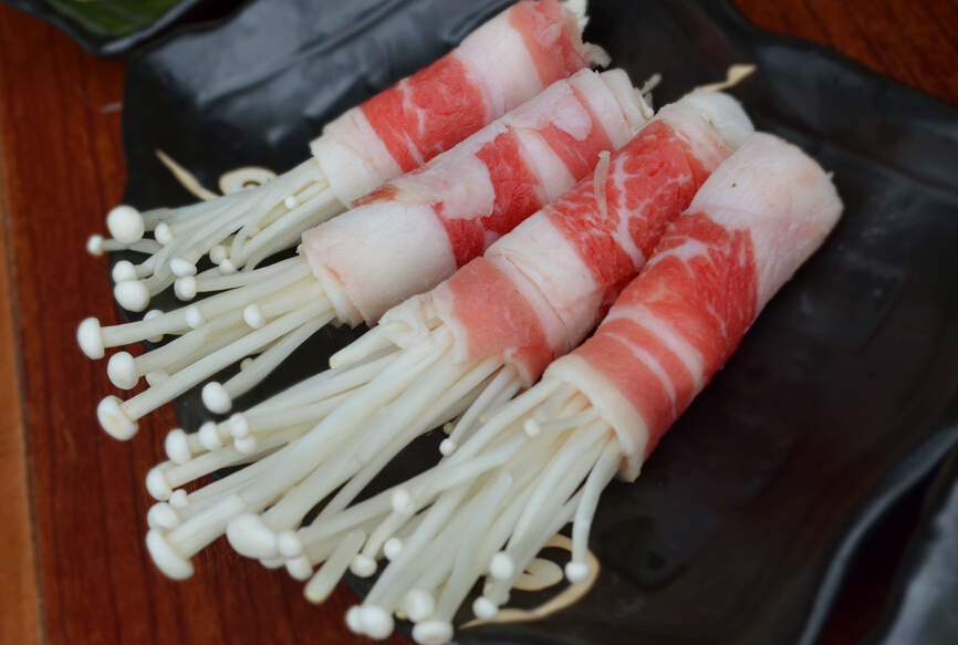 肥牛金针菇卷:金针菇跟肥牛可谓是最经典的搭配,烤至渗出油的肥牛散发出阵阵诱人的香味,夹杂着金针菇的蔬菜清香,一点都不觉得油腻。