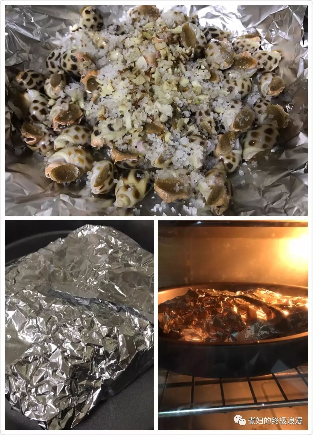 ➁ 在烤盘里铺上锡纸抹上食用油,将花螺放入铺上大量的沙姜末、红葱头末和海盐以及食用油抓匀后包好锡纸。