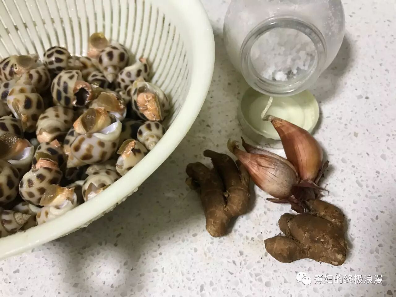 ➀ 将花螺洗干净滤干待用,因为它表面会有粘液,要多搓洗几遍哦!