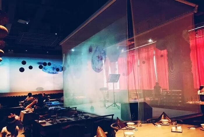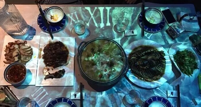 店里面灯光比较昏暗,然后有投影,应该就是主打的光影效果吧!点菜是用微信扫码点,还挺方便的!点了3个菜,一个点心!