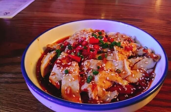 主厨口水鸡:凉菜,可以说有点冰,鸡皮有点肥有点厚,鸡肉的话汤里的比较入味一些,加醋白斩鸡的意思,里面还有黄瓜丝。——@是柚子阿_