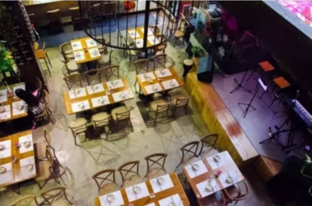这家音乐餐吧有两层,一层有个大大的舞台、