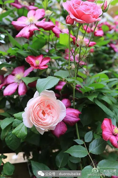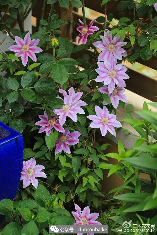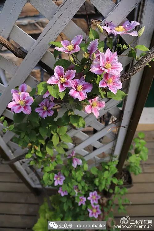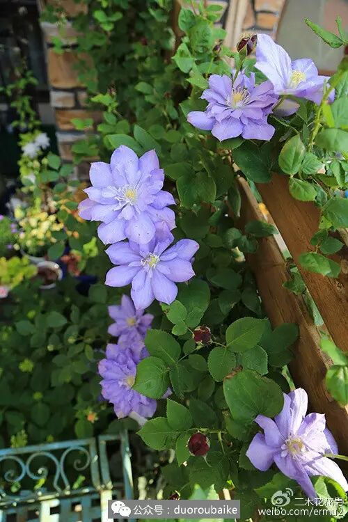 这个貌似是铁线莲-小鸭,也有两年了。不知道为什么,近两年的铁线莲都很容易出现枯萎病死掉,不过大部分还是会重新长出新枝的。小鸭去年爬的比现在还高,开花也不少,今年得了枯萎病后枝条死掉不少,感觉又从头来了。