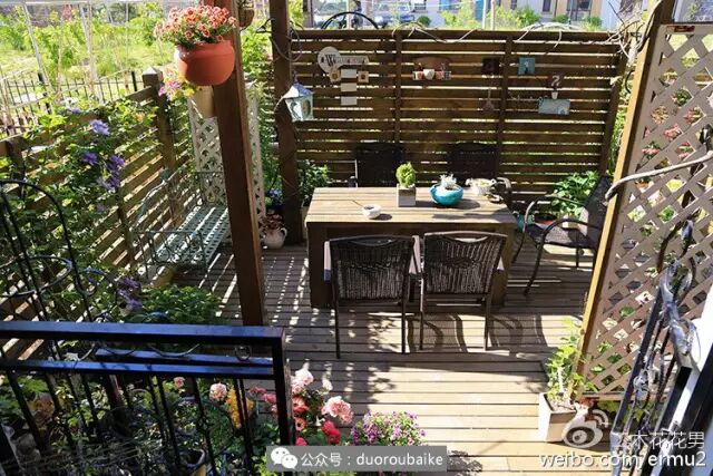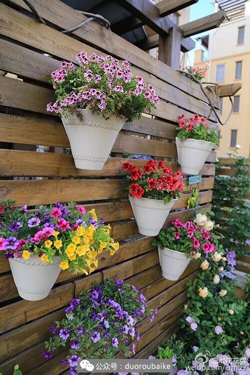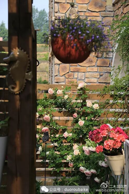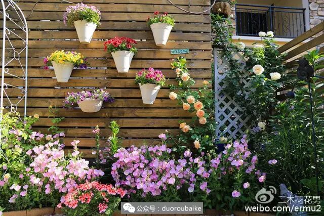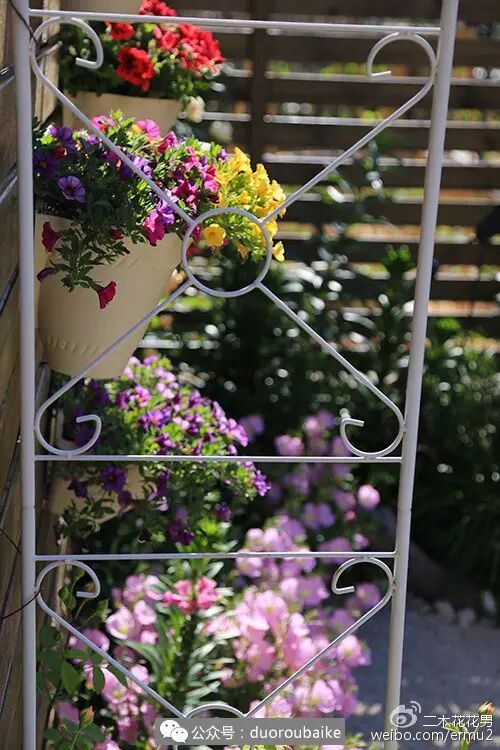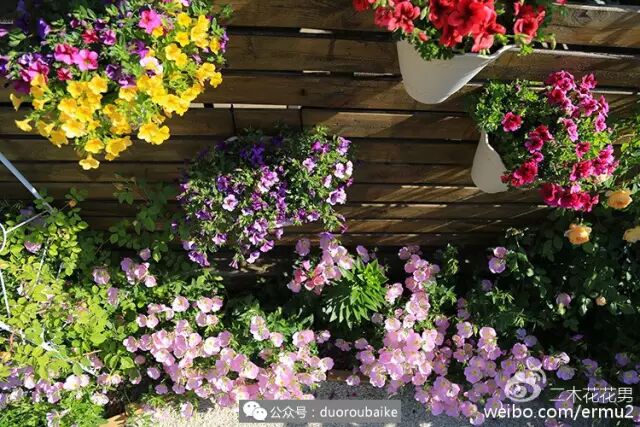 防腐木墙体是计划让铁线莲和藤月爬出一些造型,目前还没长起来,所以临时用了很多这样的挂盆 草花组合。也是今年去加州后中了天竺葵的毒,买了好多天竺葵回来。花期长、效果好、还不生虫,简直就是花园必备品!不过它们不耐寒,等到冬天就会全部移到温室里养着(都是多年生哦!),等春天再拿出来。