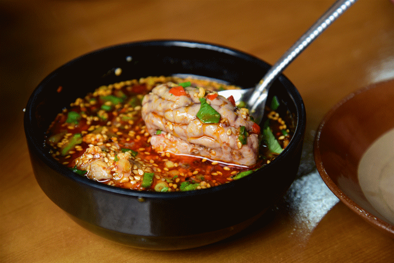 我最喜吃的必须是脑花呀,新鲜的脑花冒上一碗,颤颤巍巍带着荤香,勺子一碰就散开了。带着辣油拌着辣椒面还有花生碎。那些不爱吃脑花的人,请问咱们还有必要做朋友吗?