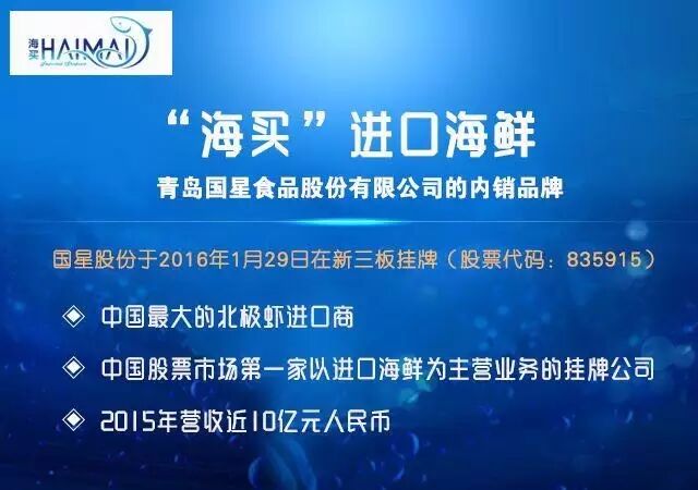 2016年1月29日,青岛国星食品股份有限公司在新三板挂牌(股票代码:835915),这是中国股票市场第一家以进口海鲜为主营业务的挂牌公司,青岛国星年营收近10亿元人民币,是中国最大的北极虾进口商,同时拥有全球深海野生海鲜采购、加工、出口、国内销售的完整产业链,其内销品牌 “海买”进口海鲜,是国内进口海鲜行业中全渠道覆盖的唯一销售商,“海买”进口海鲜品牌专卖店遍布全国多个省市。