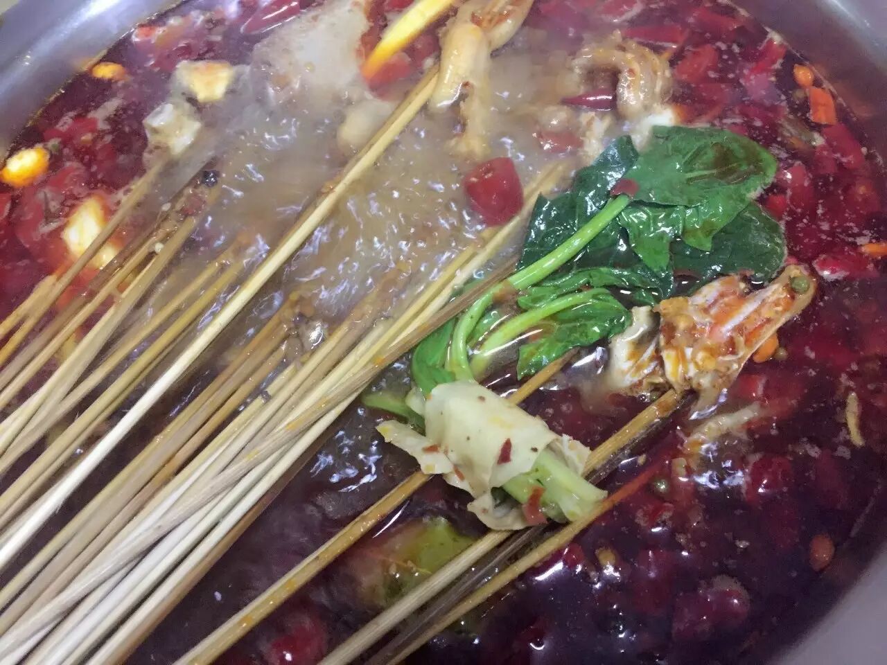 鸭血:这家店的鸭血十分新鲜,色泽光亮,厚薄适宜。夹起一块鸭血,让鸭血浸泡在寸余厚的热油中,周围是吱吱作响的辣椒及花椒,不断的散发着热烈的味蕾诱惑。一分钟后捞起,口感鲜嫩舒爽,嫩滑爽口。