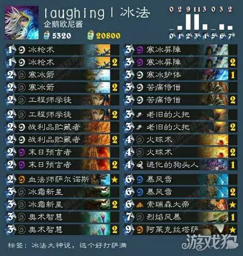 炉石传说现阶段冰法卡组上分并不难,满天梯的萨满,冰法惬意上分,轻松愉快。卡组如图,我把冰甲换成了玻璃,另外我感觉不需要烈焰风暴也能打萨满,推荐把烈焰风暴换成炎爆打防战。5级开打,到4几乎没输过,而且狗头冰打战士还是有胜率的,今天我打防战大概3胜一负。