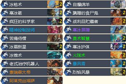 这一套费用较为廉价,但红龙和冰箱是必不可少的。我们知道冰法的前期有末日冰环的清场,末日的效果确实很不错,但如果没有的话这里我们便可以加入食尸鬼和自爆绵羊来替换。这两张效果也是不错的,防快攻一绝。不过到后期的话清场效果便不明显,所以我们以控场为主,用双暴风雪双呼啦来补足后期清场,在实战中表现还是不错的。值得一提的是这里我选择加入一张130,用来配合冰环冰锥,达到一个中期能够稍稍反场的效果,使对面将伤害打到我方随从上,从而既控了场,又间接为自己加了血,是个不错的选择。