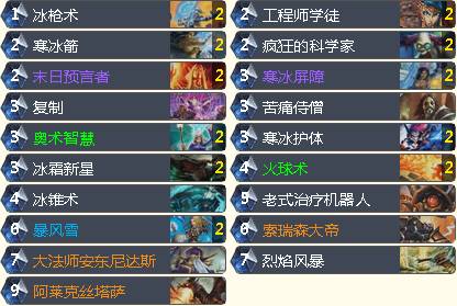 另外我没有加入血法和炎爆,反而加入一张复制,这里的原因在于除了打战士之外的职业,伤害已经足够,控场也能苟住,所以再加伤害有些多余。而加入一张复制则能添加对战士和牧师等职业的对抗性,也能在前期复制末日增加资本。但要注意的一点是手牌数目,爆牌了就有些蛋疼了。。。