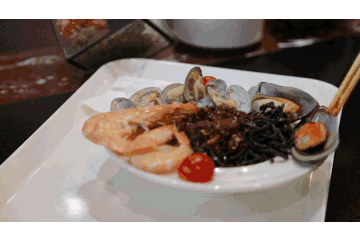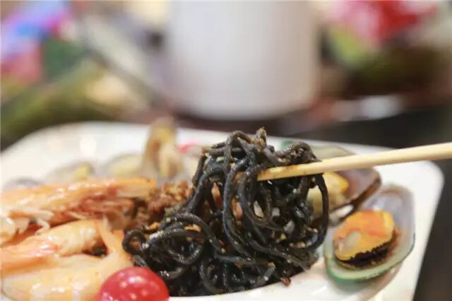 墨鱼面是意大利著名的美食。在盛产海鲜的水城威尼斯,黑墨鱼尤其出名。不囧选取的正是威尼斯进口的墨鱼汁面条,面条富有弹性,浓郁可口的海味和淡淡的橄榄油香,不愿停口。