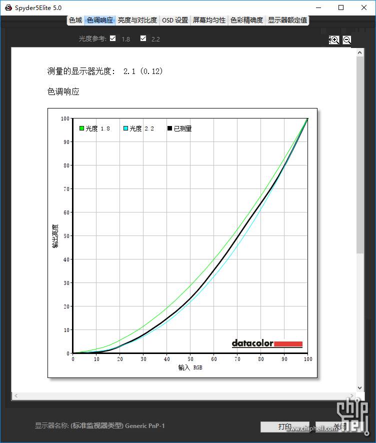 色调相应方面测量值要尽量和"光度2.2"曲线保持一致为佳,实际测量结果略有偏差.