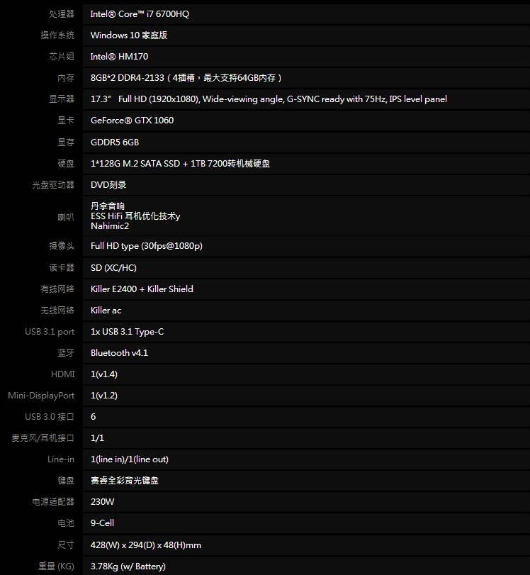 在配置方面整体跟去年的旗舰游戏本大致雷同,值得注意的是此次GPU搭载的是桌面级GTX1060,并且还是6GB的版本,屏幕分辨率为1080.不得不让人感叹数码产品的进步速度,重量方面也并不算非常巨无霸,仅3.78kg,毕竟这是一台17"的游戏笔记本.