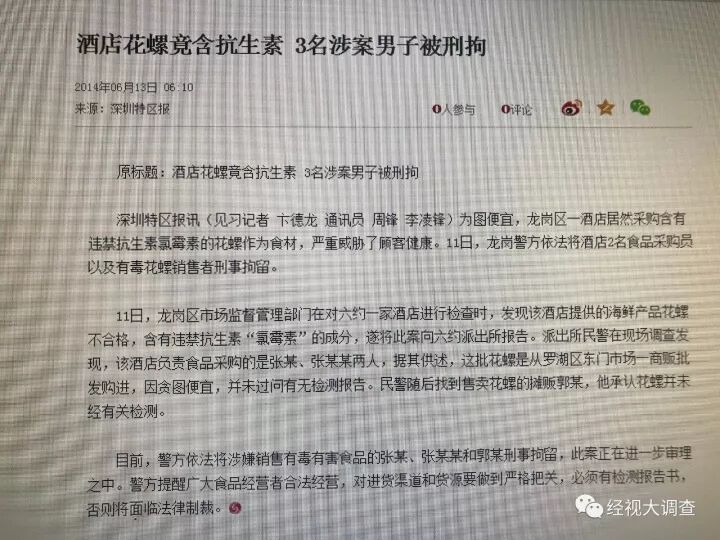 2014年深圳龙岗警方就发现了一起辖区某酒店为图利益,采购含有违禁抗生素氯霉素的花螺作为食材,严重威胁了顾客健康。龙岗警方依法将酒店2名食品采购员以及有毒花螺销售者刑事拘留。