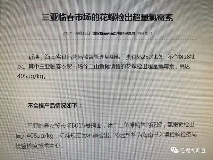 近期,海南省食品药品监督管理局组织三类食品250批次,不合格18批次。其中三亚临春农贸市场徐二山鱼摊销售的花螺检出超量氯霉素,高达405μg/kg。