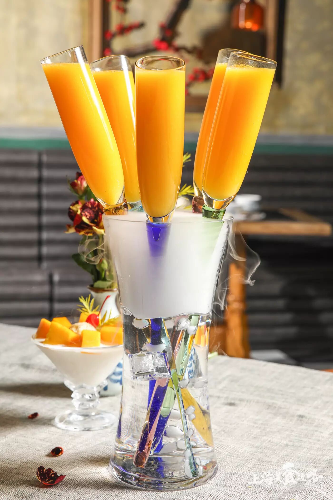 鲜榨的芒果,果肉饱满。一口全是芒果肉~还有烟雾升腾,仙气十足!这样造型的饮料,不拍拍拍简直对不起手机里的朋友了!