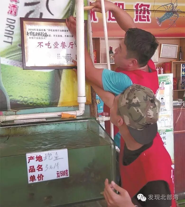 在银滩附近的几家餐厅,北海市渔政渔港监督支队执法人员发现有些餐厅非法饲养保护名录上的海龟,马上亮证执法,责令餐厅将这些海龟放生。“因为保护动物是不能买卖和非法饲养的”。